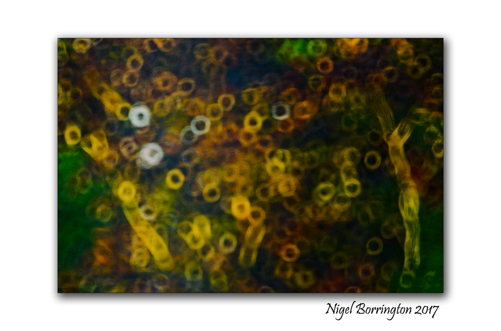 The light gaps in the trees below turn into bright cycles, the rain on the table in the background focus also does the same.