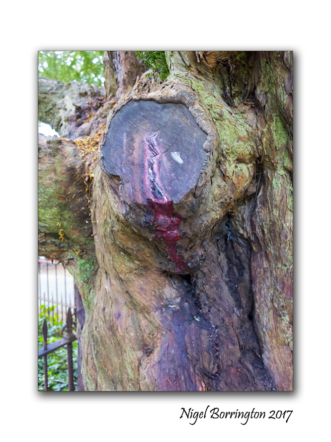 Often one sees sap coming out of an old tree, usually where it is healing up, but usually these “bleeding” areas heal up quite quickly. Recently I came across a most remarkable yew tree when I visited the ancient village of Nevern in Pembrokeshire. It has a 6th century church (St Brynach’s Church) and in the churchyard there are a number of ancient yew trees (Taxus baccata). One of these yews near to the gate is called the “Bleeding Yew” which is about 700 years old and here are some photos I took of it. It has a blood-red sap running out of it which has the consistency of blood – though it dries pink rather than brown. I dipped my finger in it and there wasn’t any distinctive smell or stain, but as people say that most parts of the yew tree are poisonous, I didn’t taste it.